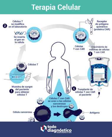 La terapia celular es la infusión o trasplante de células humanas a un paciente para el tratamiento de una enfermedad. El origen de las células puede ser del paciente o de un donante sano. Esta tecnología utiliza las propias células del paciente o del donante para brindar tratamiento a enfermedades causadas por errores en el ADN, infecciones o cáncer. Las transfusiones completas de sangre, glóbulos rojos, plaquetas, médula ósea y células T CAR, son todas formas de terapia celular.